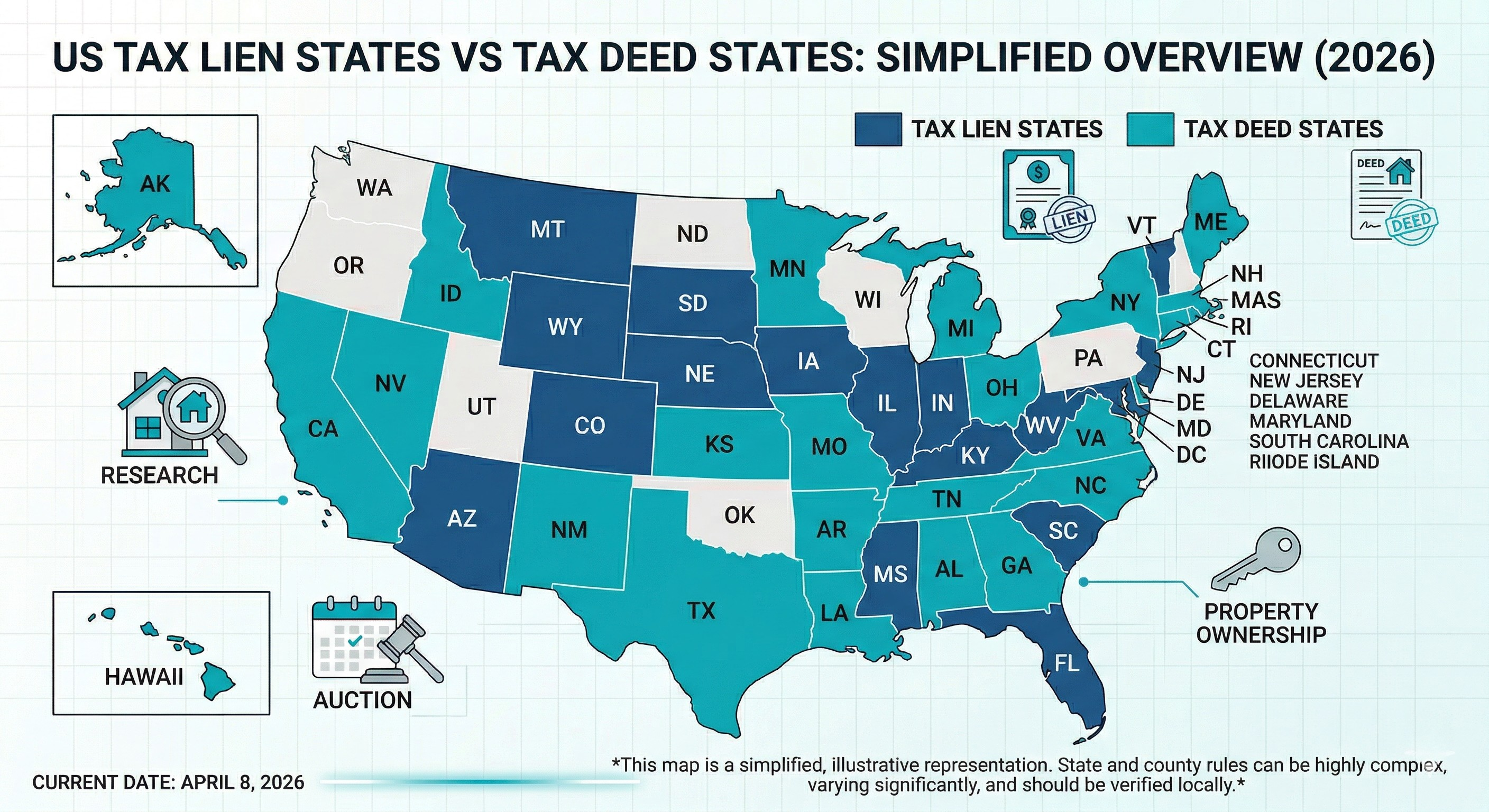 Not all tax lien states are created equal. Twenty-one states plus Washington D.C. are considered tax lien states, meaning they sell lien certificates to investors. The remaining states use a tax deed system, which works differently. Before anything else, you need to confirm that the state you are targeting operates a lien system, not a deed system.